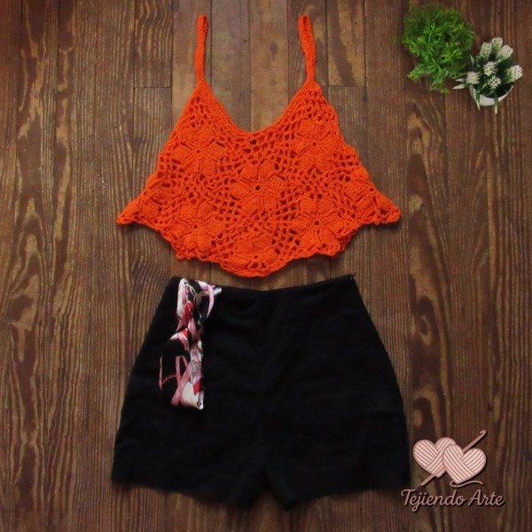 Musculosa calada corta, tejida en hilo rustico de algodón de color NARANJA SUAVE, de corte evase