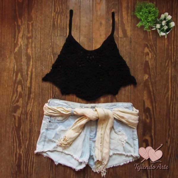 Musculosa calada corta, tejida en hilo rustico de algodón de color NEGRO, de corte evase