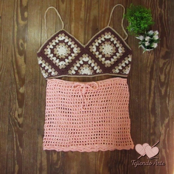 Pollera calada corta, tejida en hilo rustico de algodón de color SALMON, corte recto