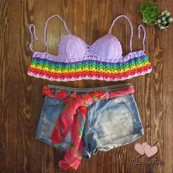 Top con taza triangular de color LILA tejido en hilo rustico de algodón y terminación en puntilla ARCO IRIS