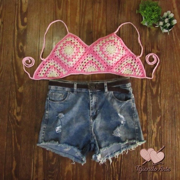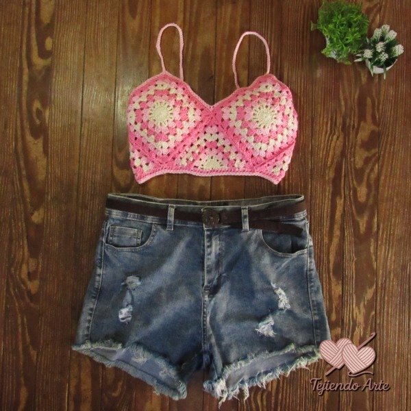 Top estilo hippie chic combinado con distintos tonos de ROSADOS y detalles en CREMA