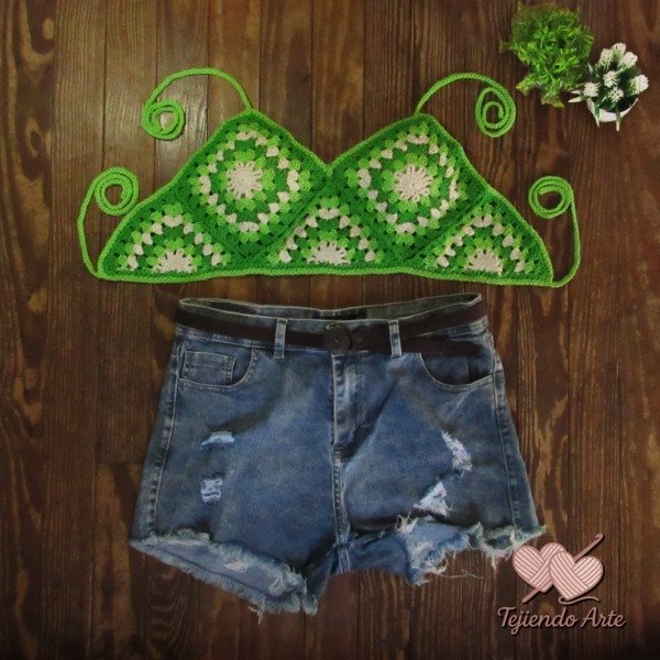 Top estilo hippie chic combinado con distintos tonos de VERDES y detalles en CREMA