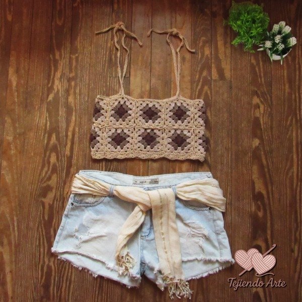 Top tipo bando con base en color BEIGE combinado con tonos de TOSTADO Y CHOCOLATE