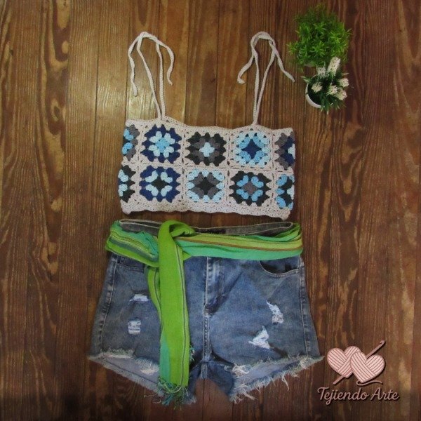 Top tipo bando con base en color GRIS combinado con tonos de CELESTES Y AZUL