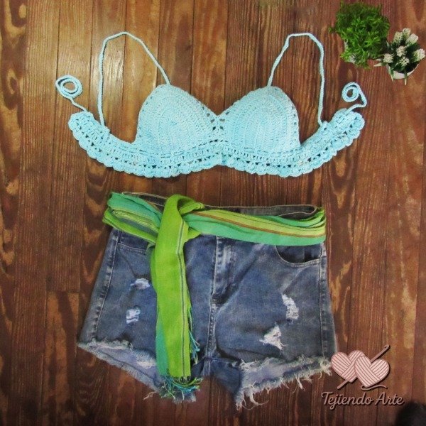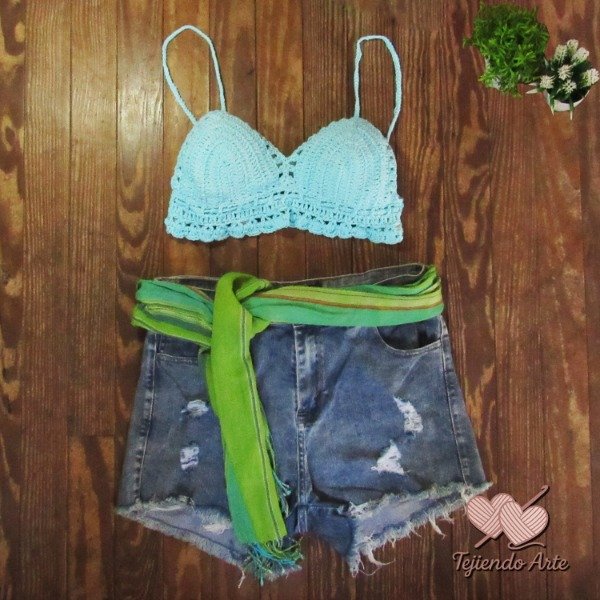 Top con taza triangular de color AQUA tejido en hilo rustico de algodón y terminación en puntilla