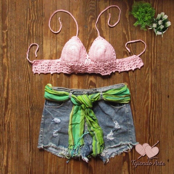 Top con taza triangular de color ROSA tejido en hilo rustico de algodón y terminación en puntilla